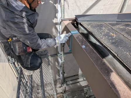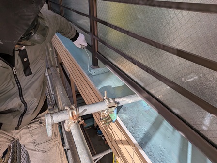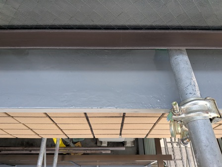 外壁改修工事では、コーキングの打替、ALC面・軒裏・樋・鉄部を塗替を行いました。バルコニーのウレタン防水も施工しました。