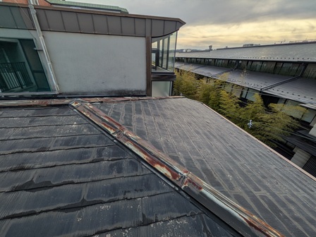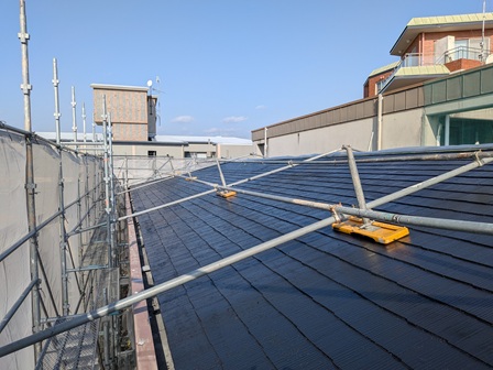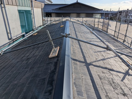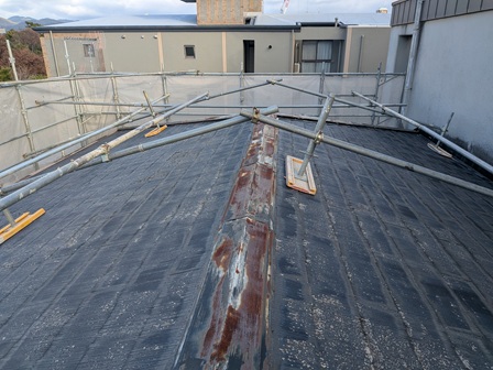 屋根改修工事では、劣化した棟押えの取替、カラーベストの塗装を行いました。